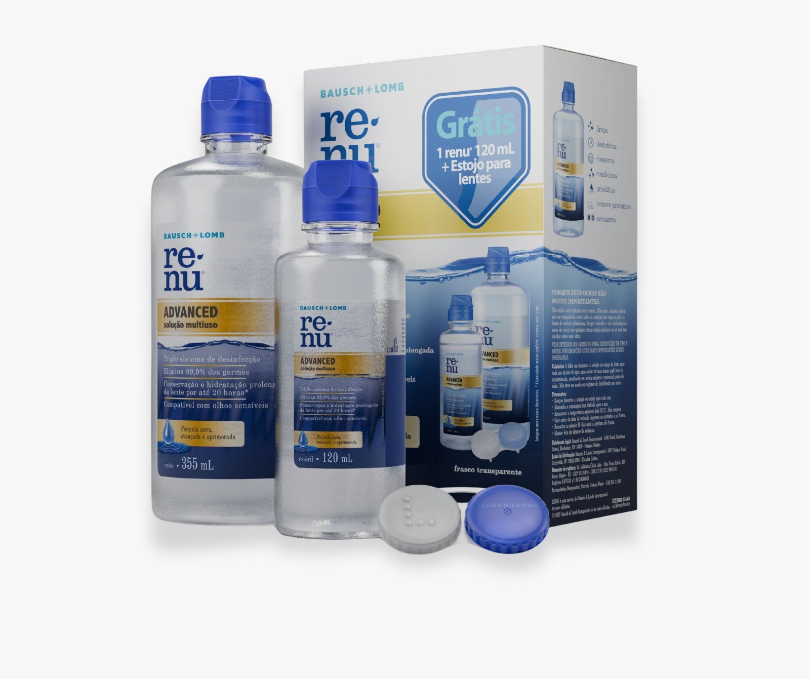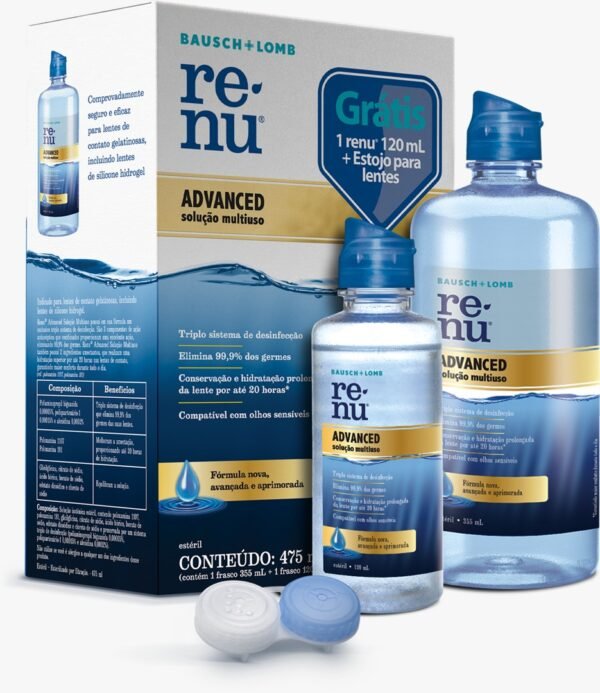 A solução multiuso Renu Advanced possui um triplo sistema de desinfecção das lentes de contato, que elimina 99,9% dos germes. Atua para desprender e remover as proteínas naturais das lágrimas – que podem ficar acumuladas e impregnadas nas lentes, causando desconforto e irritação. Além disso, Renu Advanced garante até 20 horas de hidratação da lente, sendo compatível mesmo com os olhos mais sensíveis.